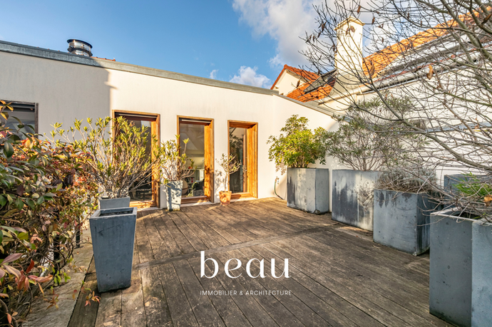 En plein cœur des Vallées, à quelques minutes à pied de la gare et de tous les commerces, très belle maison type loft d’inspiration brutaliste construite en 2016, d'une superficie carrez de 158 m² (179,35 m2 au sol) auquel s’ajoute un sous-sol de 30 m² en partie aménagée avec une chambre d'appoint, édifiée sur un terrain de 367 m² qui comprend :