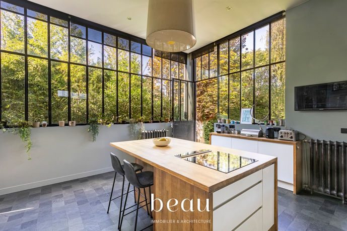 Au rez-de-chaussée : une entrée qui dessert une chambre, un bureau, une salle de bain avec toilette ainsi qu’une grande cuisine dinatoire entièrement équipée et baignée de lumière grâce à ses verrières toute hauteur et son accès direct au jardin,